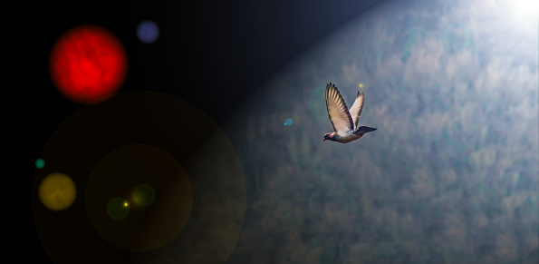 bird flying in space illuminated by light beams in colorful fantasy scenery